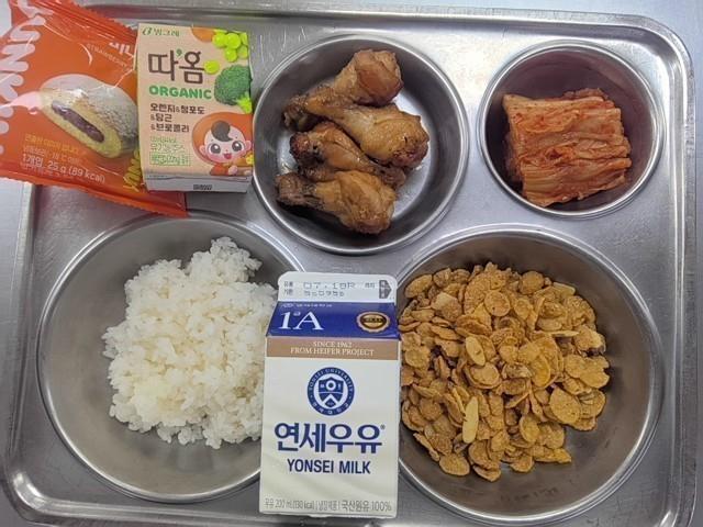 조식 시리얼-아몬드(5.6) 현미밥 닭봉구이(5.6.13.15) 배추김치(9) 머스터드소스(1.5.6.13) 백색우유(2) 스트로베리미니도넛(1.2.5.6) 오가닉주스(주황)(13)