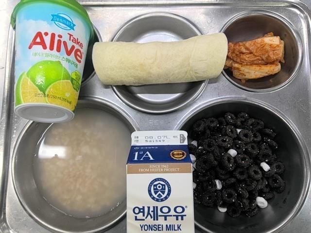 시리얼-오레오 (5.6)누룽지숭늉 배추김치 (9)백색우유 (2)블러드오렌지주스 (13)치킨스낵랩 (1.2.5.6.12.13.15.18)