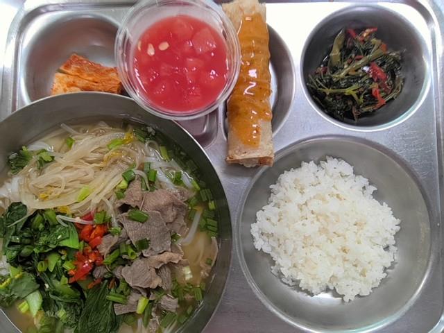 쌀밥-소량(먹을사람만) 양지쌀국수 (16)공심채(모닝글로리)볶음 (5.6.13.18)넴롤짜조/스위트칠리소스 (1.5.6.10.12.13)배추김치 (9)땡모반(수박주스) (2)