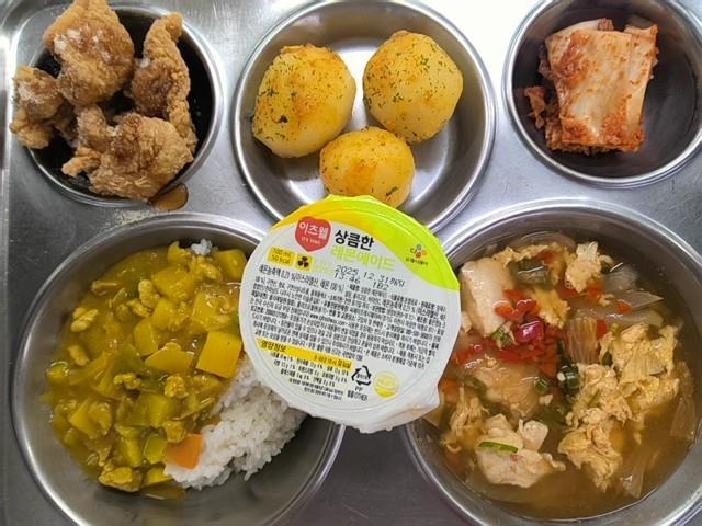 석식 카레라이스 (2.5.6.10.12.13.16) 순두부찌개 (1.5.6.8.9.18) 간지치킨 (5.15.18) 알감자버터구이 (2.5) 배추김치 (9) 레몬에이드 (13)