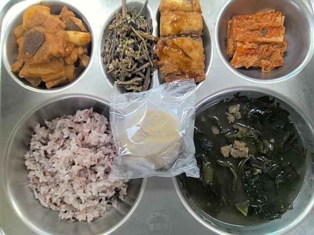 중식 검정쌀밥 쇠고기미역국 (5.6.8.9.16.18) 매운돼지갈비찜 (5.6.10.13) 고사리나물(자율) (5.6) 순살삼치카레구이 (2.5.6.12.13.16.18) 배추김치 (9) 데리야끼소스 (5.6.13) 쿠앤크마카롱 (1.2.6)