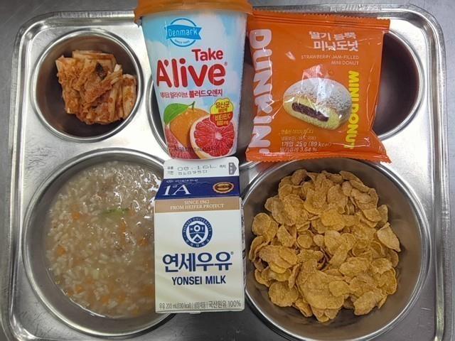 조식 시리얼-콘푸라이트 (5.6) 한우야채죽 (16) 배추김치 (9) 백색우유 (2) 스트로베리미니도넛 (1.2.5.6) 스위티자몽주스(큰컵) (13)