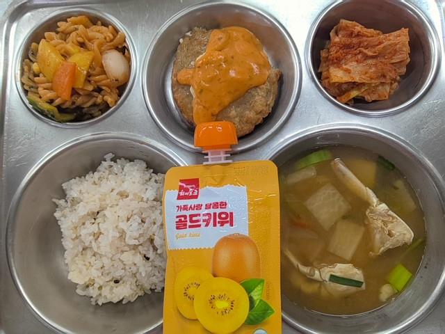 석식 혼합잡곡밥 (5) 꽃게된장국 (5.6.8.9.18) 푸실리케첩볶음 (1.5.6.12.13) 더블치즈함박스테이크 (1.2.5.6.10.15.16) 배추김치 (9) 골드키위주스 (13)