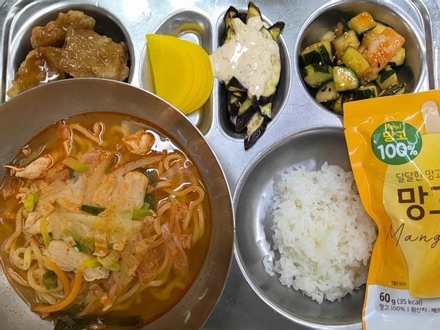 중식 쌀밥-소량(먹을사람만) 닭고기짬뽕 (5.6.9.15.17.18) 오이송송이 (5.6.13) 등심꿔바로우/소스 (1.5.6.10.13) 가지구이(자율) 노란단무지 참깨드레싱(자율) (1.5) 아이스망고바