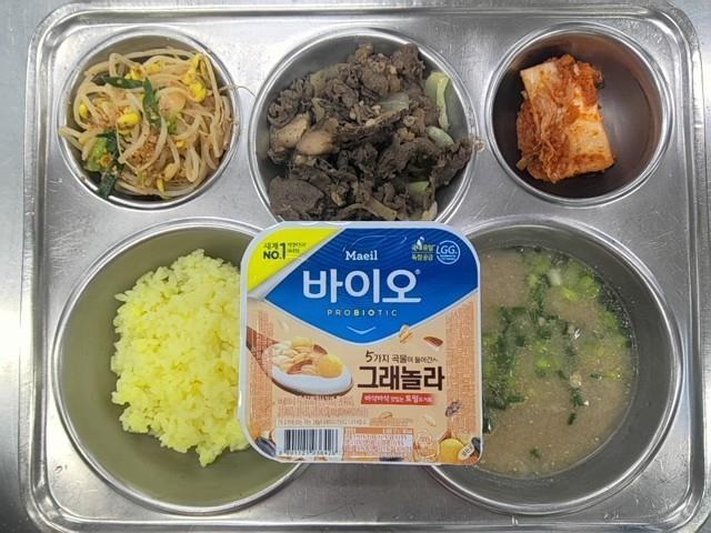 조식 강황쌀밥 들깨무채국 (5.6.8.9.18) 붉은콩나물무침 (5) 쇠고기불고기-당면없음 (5.6.13.16) 배추김치 (9) 떠먹는요구르트-그래놀라 (2)