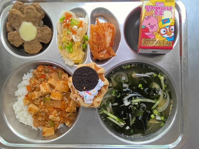 마파두부덮밥 (5.6.10.12.13.18)오이미역냉국 (5.6.8.9.13.16.18)배추찜(자율) (5.6.13.18)활짝 핀 떡갈비 (5.6.10.15.16.18)깍두기 (9)딸기바나나라떼 (2)오레오와플 (1.2.5.6)