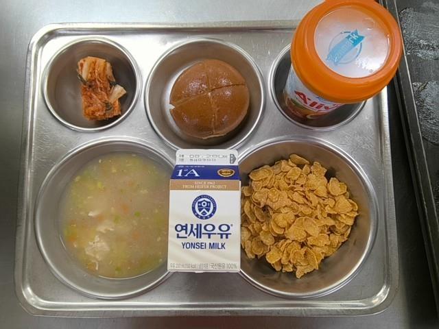 시리얼-콘푸라이트 (5.6)사쪽마늘빵 (1.2.5.6.13)닭야채죽 (15)배추김치 (9)백색우유 (2)블러드오렌지주스 (13)
