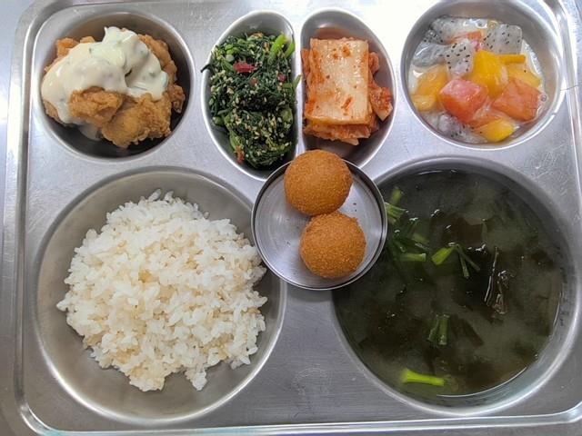 중식 현미밥 미역미소국 (5.6.8.9.18) 쑥갓나물무침(자율) (5.6) 순살치킨/청양마요소스 (1.5.6.13.15) 치즈볼 (1.2.5.6) 배추김치 (9) 열대과일샐러드 (1.2.5.6)