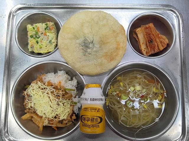 석식 눈꽃치즈제육덮밥 (2.5.6.10.13) 맑은콩나물국 (5.6.8.9.18) 삼색계란찜 (1) 쫄깃한감자호떡 (1.2.5.6) 배추김치 (9) 저당요구르트 (2)