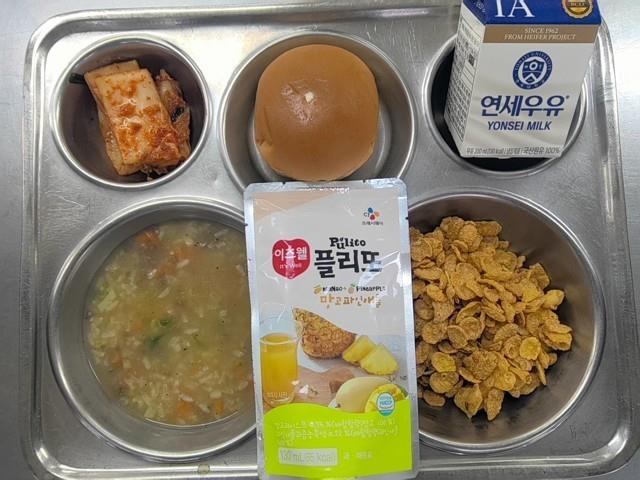 조식 시리얼-아몬드 (5.6) 한우야채죽 (16) 배추김치 (9) 백색우유 (2) 망고파인애플주스 (13) 우유생크림빵 (1.2.5.6)