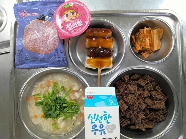 조식 영양닭죽(15) 블루베리도넛(1.2.5.6) 소떡갈떡&소스(2.5.6.10.12.13.15.16) 직접담은김치(자율)(9) 과일젤리 시리얼우유(2) 초코첵스시리얼(5.6)