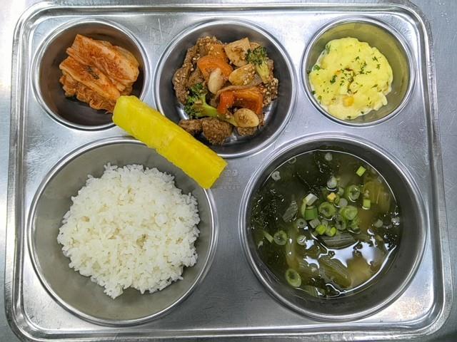 석식 친환경쌀밥 단배추된장국(5.6.8.9.18) 큐브스테이크(5.6.10.12.13) 콘치즈구이(1.2.5.13) 직접담은김치(자율)(9) 파인애플스틱