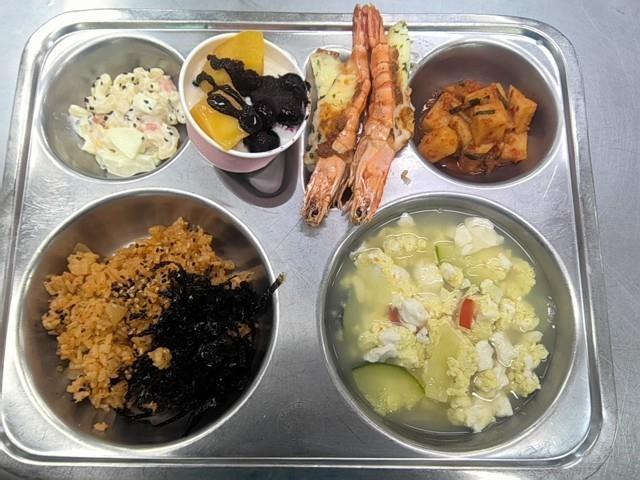 중식 김치볶음밥&김가루 (5.6.9.13.18) 맑은순두부탕 (1.5.8.9.18) 마카로니콘샐러드(자율) (1.5.6.13) 블랙타이거새우치즈구이 (2.9.13) 직접담은깍두기(자율) (9) 영양쌤표 요아정 (1.2.5.6.13)