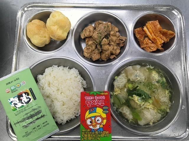 조식 친환경쌀밥 물만두국 (1.5.6.8.9.10.16.18) 맛김 데리야끼닭구이 (5.6.13.15) 직접담은김치(자율) (9) 화이트슈 (1.2.5.6) 딸기우유 (1.2)