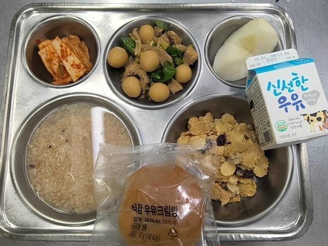 조식 우유크림빵(1.2.5.6.10) 누룽지숭늉 메추리알돈장조림(1.5.6.10.13) 직접담은김치(자율)(9) 그래놀라시리얼(5.6) 배(과일) 시리얼우유(2)