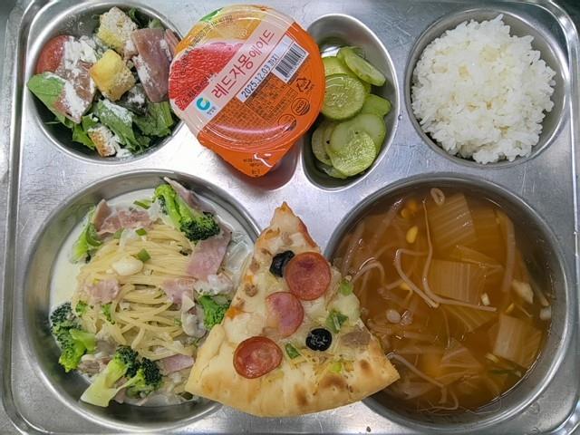 중식 미니밥(자율) 땡초크림스파게티(1.2.5.6.10.13) 김치콩나물국(5.8.9.18) 수제오이피클(자율)(13) 시저샐러드&오리엔탈D(2.5.6.10.12) 레드자몽에이드 콘크러스트피자(1.2.5.6.10.12.13.15.16)