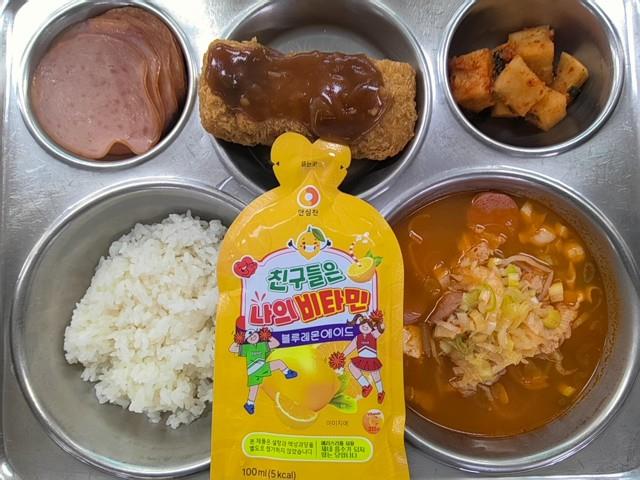 석식 친환경쌀밥 얼큰부대찌개(1.2.5.6.8.9.10.15.16.18) 임실치즈롤가스&수제소스(1.2.5.6.10.12.13.16.18) 싸먹는오리햄(1.2.5.6.10.16) 직접담은깍두기(자율)(9) 비타민주스(13)