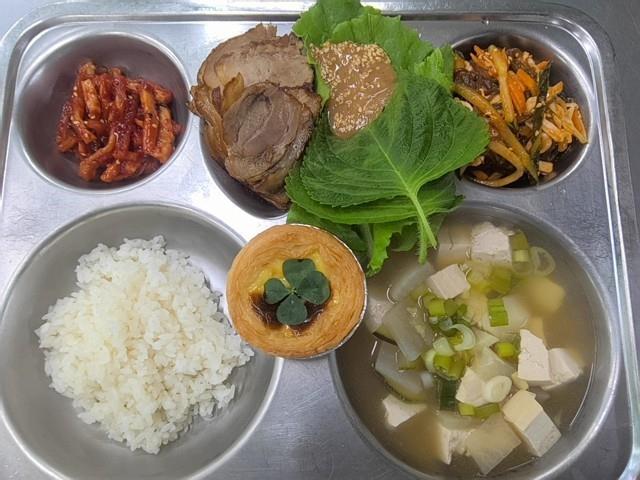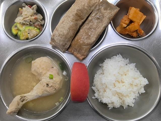 석식 친환경쌀밥 누룽지닭다리삼계탕 (15) 들깨버섯호박볶음(자율) 불고기&김치메밀전병 (1.2.3.5.6.8.9.10.12.15.16.18) 직접담은깍두기(자율) (9) 사과