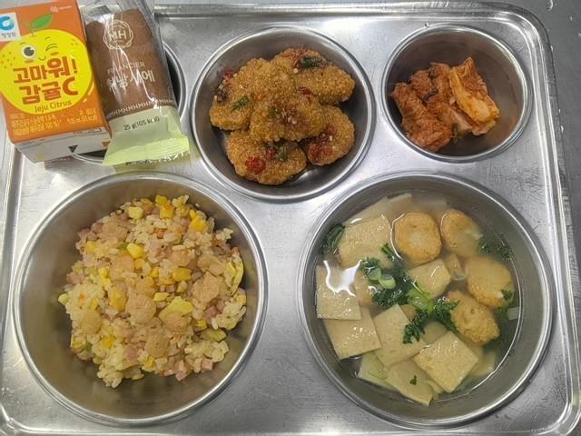 조식 새우볶음밥 (1.5.6.9.10.12.13.16.18) 매콤어묵국 (1.5.6.8.9.18) 크리스피돈육강정 (2.5.6.10.12.16.18) 직접담은김치(자율) (9) 제주감귤주스 (13) 휘낭시에 (1.2.5.6)