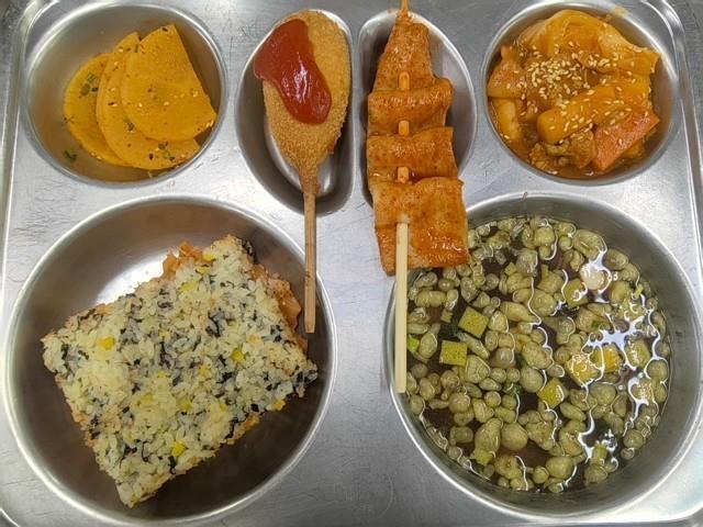 중식 수제함고스밥버거(1.2.5.9.13.16.18) 맑은장국(1.2.5.6.7.8.9.13.18) 매운꼬치어묵(1.5.6.13.16) 단무지무침(자율) 분모자떡볶이(1.5.6.8.9.10.12.13.18) 더블치즈폭탄핫도그(1.2.5.6)