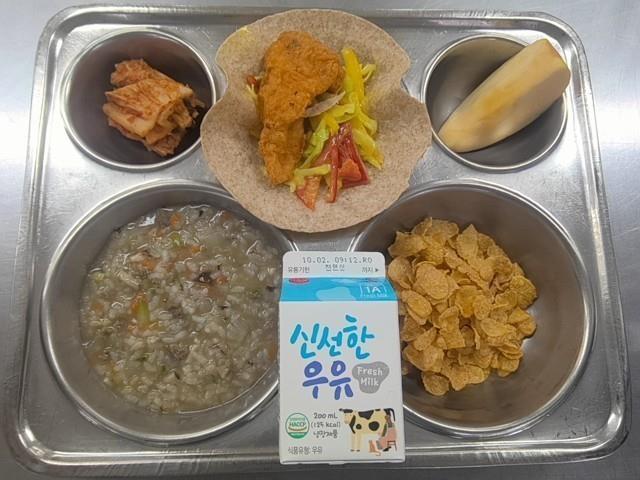 조식 쇠고기채소죽(5.6.16) 치킨또띠아(1.2.5.6.15.18) 직접담은김치(자율)(9) 곡물시리얼(5.6) 사과 시리얼우유(2)