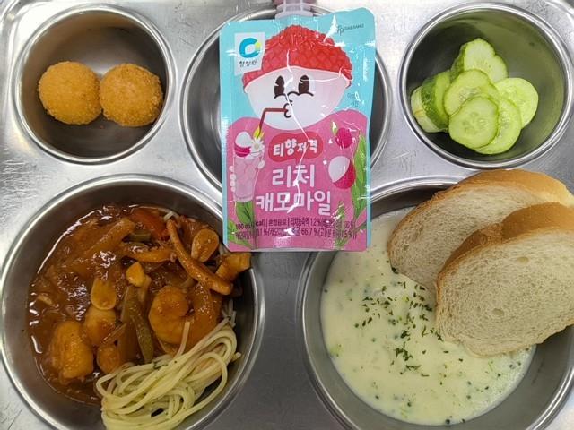 석식 브로콜리크림스프&바게트(2.5.6.13.15.16) 상하이파스타(1.2.5.6.8.9.12.15.16.17.18) 수제오이피클(자율)(13) 모짜렐라치즈볼(2.5.6) 리치캐모마일주스