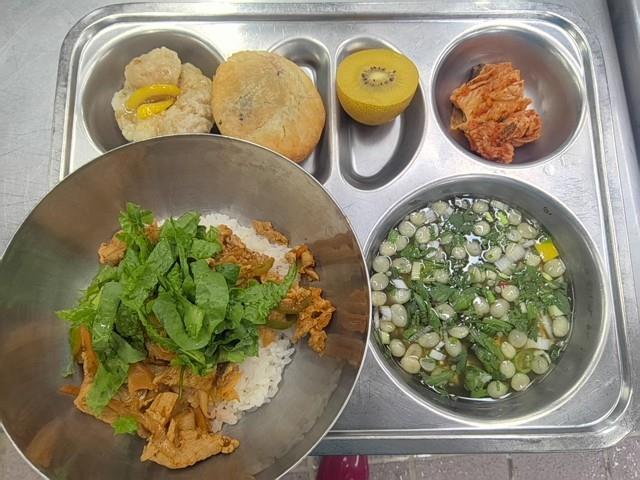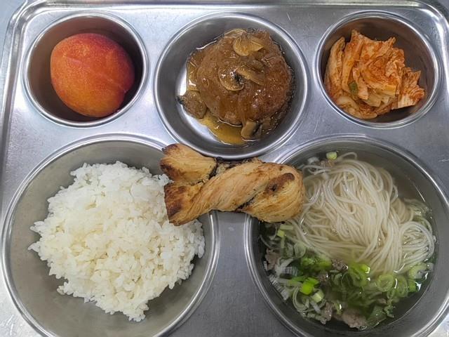 검정쌀밥 종합어묵국 (1.5.6.8.9.18)콘치즈 (1.2.5.6.13)꼬꼬아*숯불치킨/라면사리 (2.5.6.15)직접담은깍두기 (9)쥬시복숭아 (2.11)