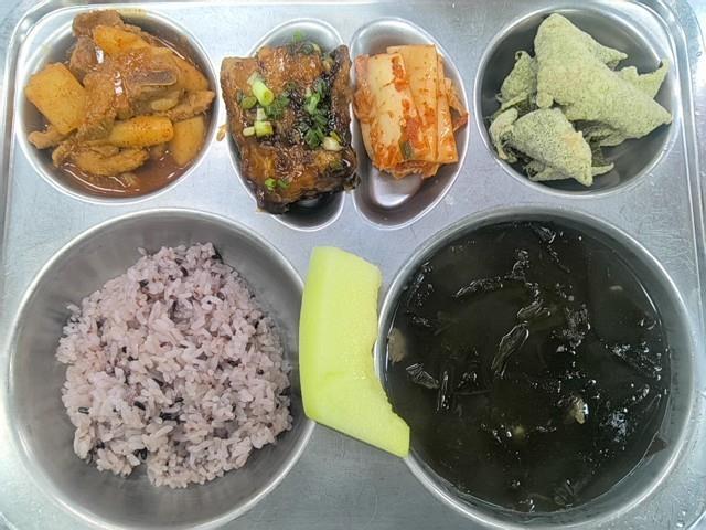 중식 검정쌀밥 쇠고기미역국 (5.6.8.9.16.18) 매운돼지갈비찜 (5.6.10.13) 임연수양념구이 (5.6.13) 배추김치 (9) 멜론 찹쌀다시마부각 (5.6)