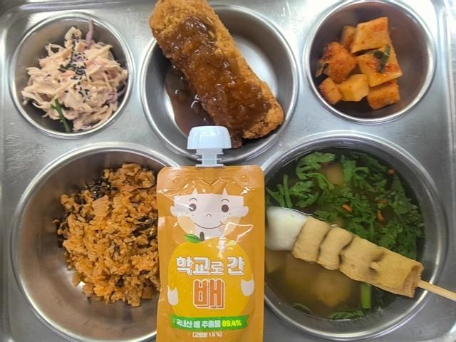 석식 햄김치볶음밥 (1.2.5.6.9.10.13.15.16) 떡어묵꼬지국 (1.5.6.8.9.18) 양배추샐러드 (1.5.12) 고구마치즈돈까스/소스 (1.2.5.6.10) 직접담은깍두기 (9) 배주스 (13)
