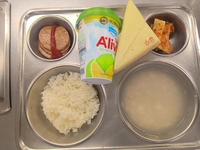 조식 칼슘쌀밥 햄앤치즈샌드 (2.5.6) 누룽지숭늉(자율) 사각햄구이/개별용케첩 (1.2.5.6.10.12.15.16) 배추김치 (9) 스위티자몽주스(큰컵) (13)