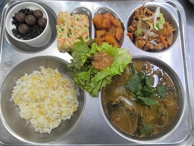 중식 찰기장밥 추어탕 (5.6.18) 삼색계란찜 (1) 김치제육볶음 (5.6.9.10.13) 직접담은깍두기 (9) 엄마는외계인요거트 (1.2.5.6) 상추쌈(자율)