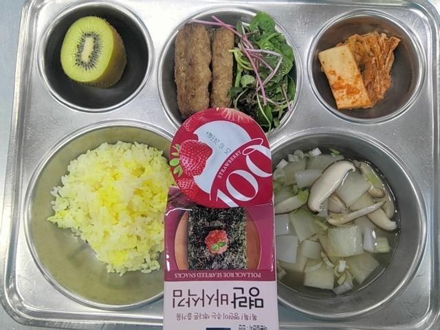 조식 강황쌀밥 표고버섯무국 (5.6.8.9.13.18) 명란맛바삭김 떡갈비스틱/어린잎&파인소스 (1.2.5.6.10.15) 배추김치 (9) 떠먹는요구르트-딸기 (2) 그린키위