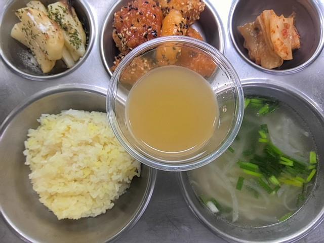 석식 강황쌀밥 들깨무채국 (5.6.8.9.18) 허니버터웨지감자구이 (2.5.6.13) 콰싹바싹순살치킨 (1.2.5.6.12.13.15) 배추김치 (9) 수제사과에이드 (13)