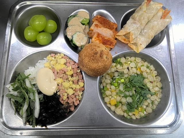 비건햄마요덮밥 (1.5.6.10.13.18)달콤바삭찰보루빵 (1.2.5.6)가쓰오장국 (1.2.5.6.7.8.9.18)오이참깨샐러드(자율) (1.5)통새우만두 (1.5.6.9.10.16)배추김치 (9)배추김치담는날 (9)샤인머스켓
