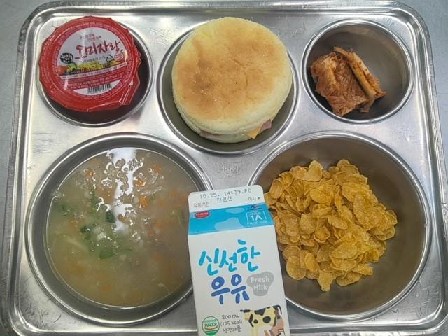 시리얼-콘푸라이트 (5.6)한우야채죽 (16)베이컨에그머핀 (1.2.5.6.10.13)배추김치 (9)백색우유 (2)오미자주스 (13)