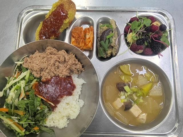 중식 참치야채비빔밥/초고추장 (5.6.12.13.16.18) 두부된장국 (5.6.8.9.18) 망고바나나샐러드 (1.2.5.6) 가지나물무침(자율) (5.6) 통닭다리살꼬치 (1.5.6.15.16) 배추김치 (9)