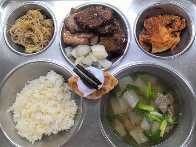 석식 찰기장밥 맑은소고기무국 (5.6.8.9.16.18) 숯불직화통바베큐 (5.6.10.16) 숙주나물볶음 (5.6.13) 배추김치 (9) 오레오크로플 (1.2.5.6)