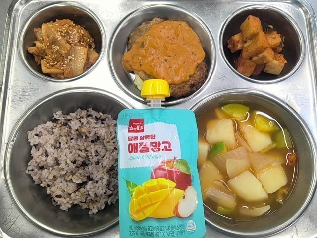 조식 혼합잡곡밥 (5) 감자호박고추장찌개 (5.6.8.9.18) 참치김치볶음 (5.9.16.18) 더블치즈함박스테이크*소스 (1.2.5.6.10.15.16) 직접담은깍두기 (9) 애플망고주스 (13)