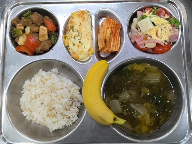 중식 찰보리밥 단배추된장국(5.6.8.9.18) 시저샐러드&오리엔탈D(2.5.6.10.12) 콘치즈구이(1.2.5.13) 한입목살스테이크(2.5.6.10.12.13.15.16) 직접담은김치(자율)(9) 바나나