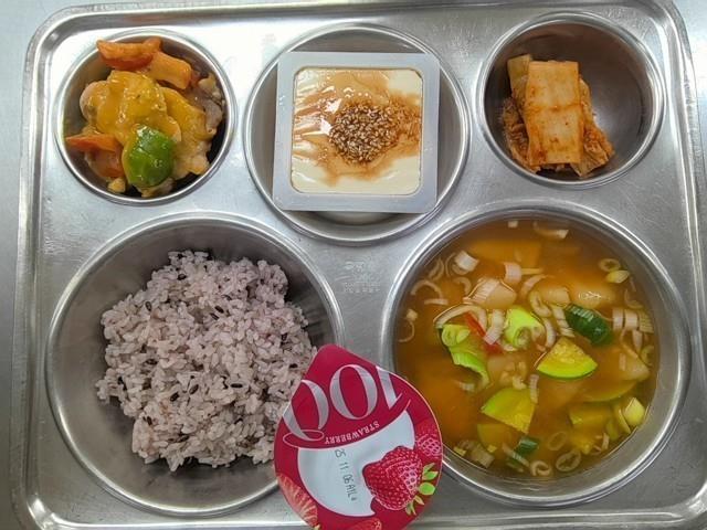 조식 검정쌀밥 감자호박고추장찌개(5.6.8.9.18) 꼬마연두부/양념장(5.6) 허브치킨찹스테이크*소스(5.6.15) 배추김치(9) 드링크요구르트-딸기(2)