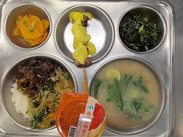 석식 자장잡채밥(1.5.6.8.9.10.13.16.18) 나가사끼짬뽕국(5.6.8.9.10.13.17.18) 근대나물무침(자율) 단무지무침(자율) 오리다리살꼬치(1.5) 레드자몽에이드