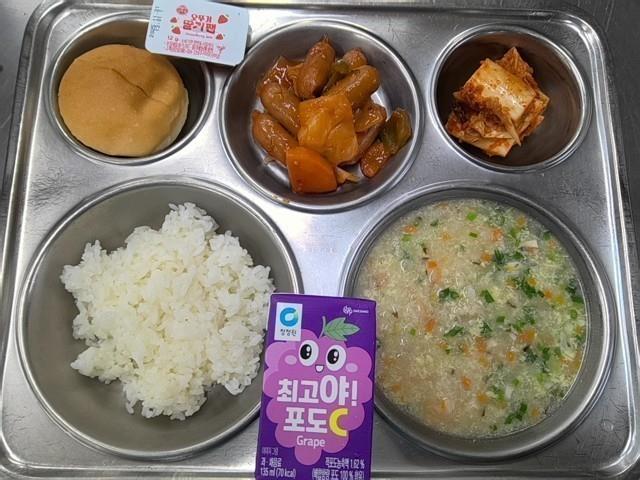 조식 친환경쌀밥 새우달걀죽(1.5.6.9.13) 모닝빵&딸기잼(2.5.6.11.13.15.18) 비엔나채소볶음(2.5.6.10.12.13.15.16) 직접담은김치(자율)(9) 포도주스(13)