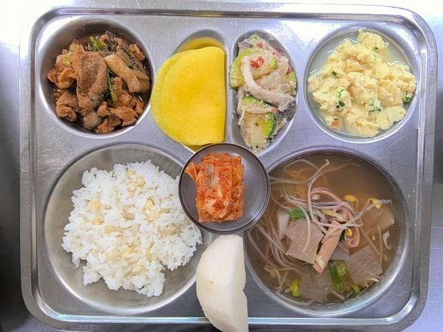 중식 찰옥수수밥 오징어무국(5.8.9.17.18) 몽글몽글달걀찜(1.8.9.13.18) 고추장오리불고기(2.5.6.13) 들깨버섯호박볶음(자율) 직접담은김치(자율)(9) 배(과일)