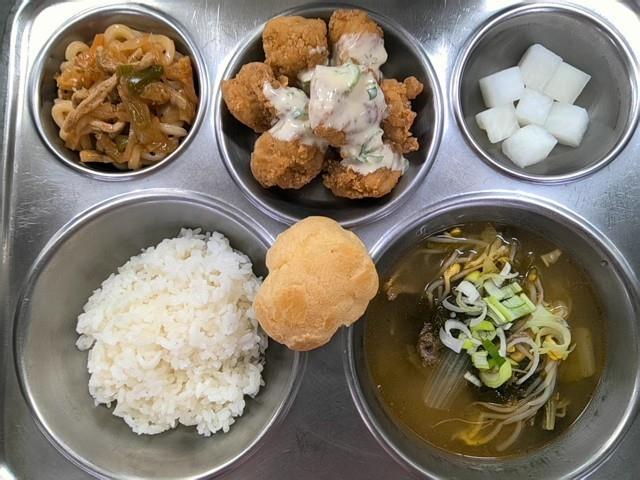 석식 친환경쌀밥 사골우거지국(5.6.16) 매콤우동볶음(5.6.9.10.13.17.18) 수제순살치킨&청양마요소스(1.2.5.6.12.13.15.16.18) 무피클(자율) 화이트슈(1.2.5.6)