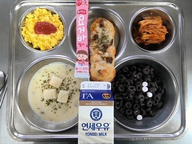 조식 양송이스프&크루통(2.5.6.13.15.16) 불고기피자빵(1.2.5.6.10.12.15.16) 스크램블에그(1.12) 직접담은김치(자율)(9) 시리얼우유(2) 오레오시리얼(2.5.6) 짜먹는요구르트(2.12)