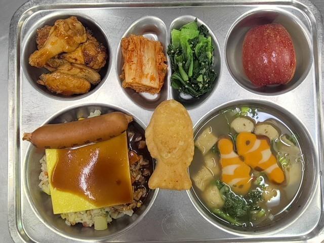 중식 소시지오므라이스(1.2.5.6.10.12.13.15.16.18) 니모어묵국(1.5.6.8.9.18) 청경채나물(자율) 숯불닭봉&윙구이(5.6.12.13.15) 직접담은김치(자율)(9) 사과 팥슈크림붕어빵(1.2.5.6.16)