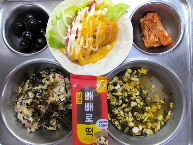 석식 김밥볶음밥(1.5.6.8.10.12.13.16) 맑은장국(1.2.5.6.7.8.9.13.18) 치킨또띠아(1.2.5.6.15.18) 직접담은김치(자율)(9) 머루포도 우리쌀빼빼로떡