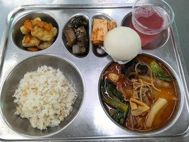 중식 귀리밥 한국식마라탕 (2.5.6.10.13.16) 가지굴소스볶음 (5.6.13.18) 찹쌀꿔바로우&소스 (1.5.6.10.13) 직접담은김치(자율) (9) 수제오미자에이드 미니단팥호빵 (1.2.5.6)
