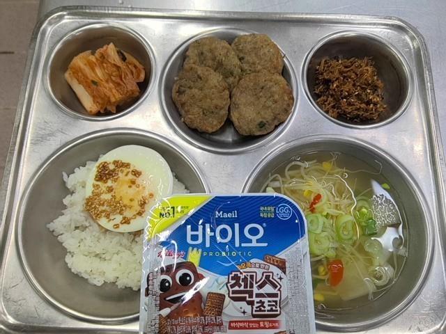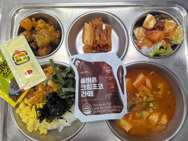 조식 간장계란밥 (1.5.6) 얼큰콩나물국 (5.8.9.18) 멸치고추장볶음 (5.6.13) 고추잡채주먹완자 (1.2.5.6.10.15.16.18) 직접담은김치(자율) (9) 토핑요거트(첵스초코) (2.5.6)
