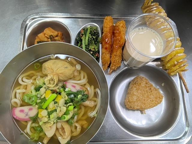 중식[다채롭데이(채식급식)] 참치마요구운주먹밥(5.6.13.16) 한그릇우동(1.2.5.6.7.8.9.10.13.16.18) 열무된장무침(자율)(5.6) 새우튀김&칠리소스(1.5.6.9.12) 직접담은깍두기(자율)(9) 수제흑당버블티(2) 회오리감자(5.6)